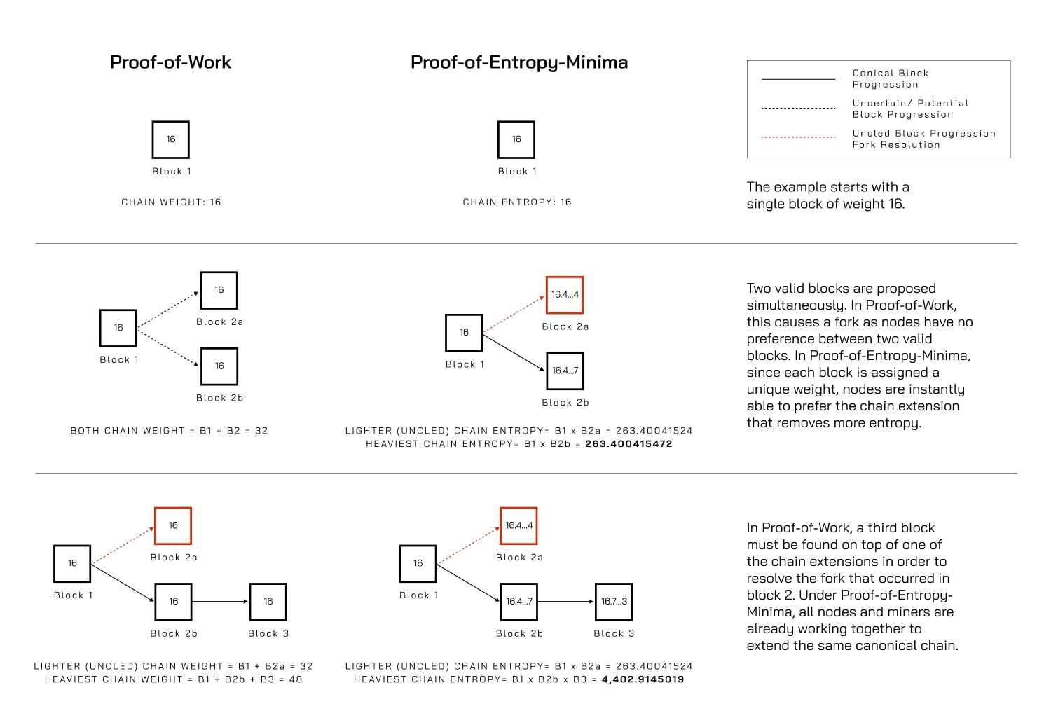PoEM combines the strengths of PoW’s objective framework with improvements in efficiency and scalability. It ensures instantaneous fork resolution through the concept of intrinsic block weight. This allows nodes to deterministically select the next block, eliminating the prolonged uncertainty seen in PoW and the propagation delays in PoS.