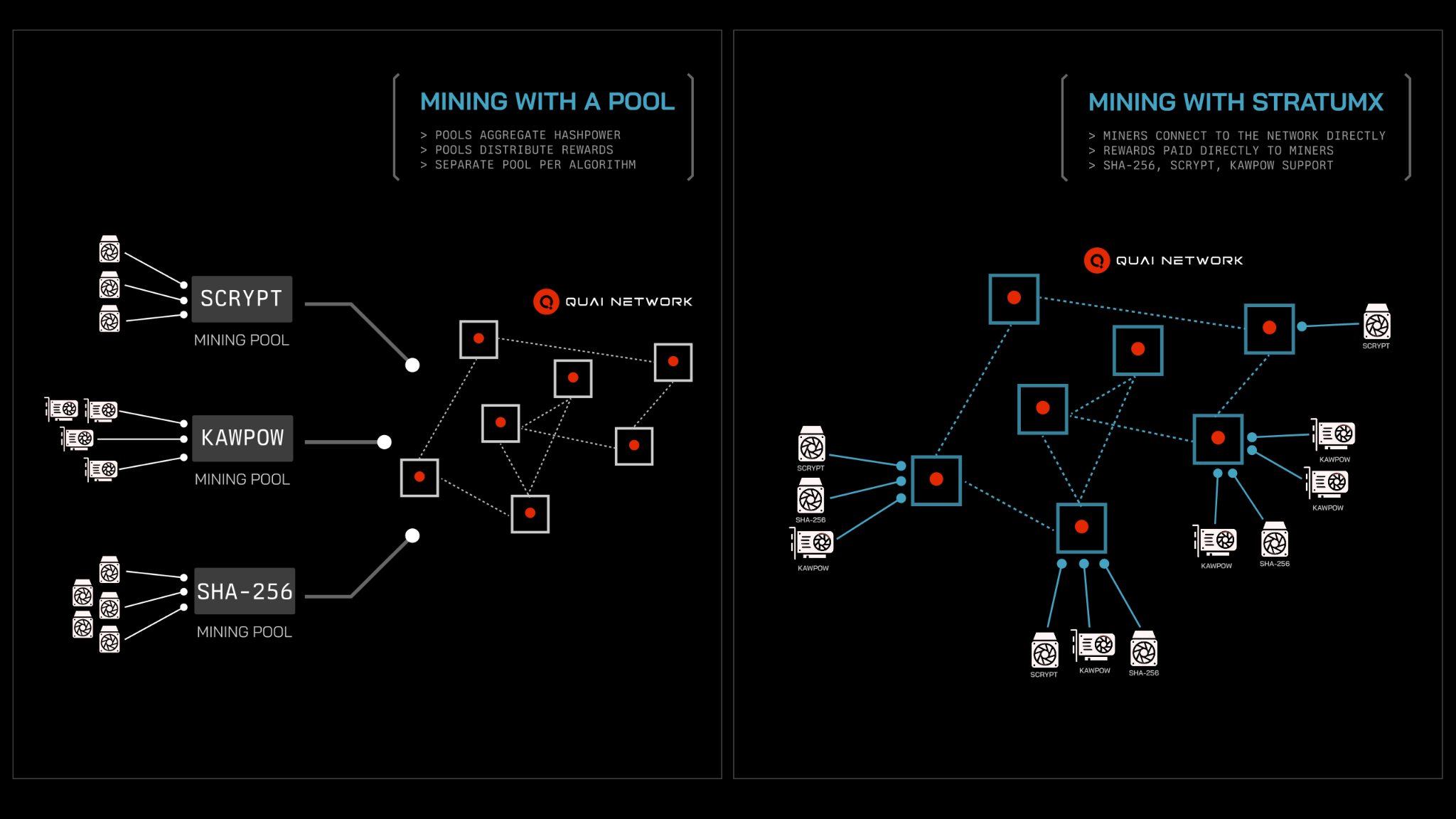StratumX supports multi-algorithm mining, enabled by Quai’s merged-mining architecture and the SOAP upgrade.